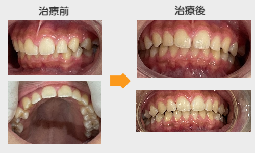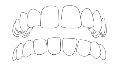 上側の前歯が大きく前に傾斜していたり、上の歯ならび全体が前に出て噛いる状態。また下のアゴが小さかったり、後ろにあることで出っ歯にみえる場合もあります。この状態は、口を楽に閉じることができず、顔のケガで前歯を折ったり、くちびるを切ったりしやすいです。下の前歯が上の前歯の裏側の歯ぐきを傷つけていることもあります。詳しくは当院までお尋ねください。